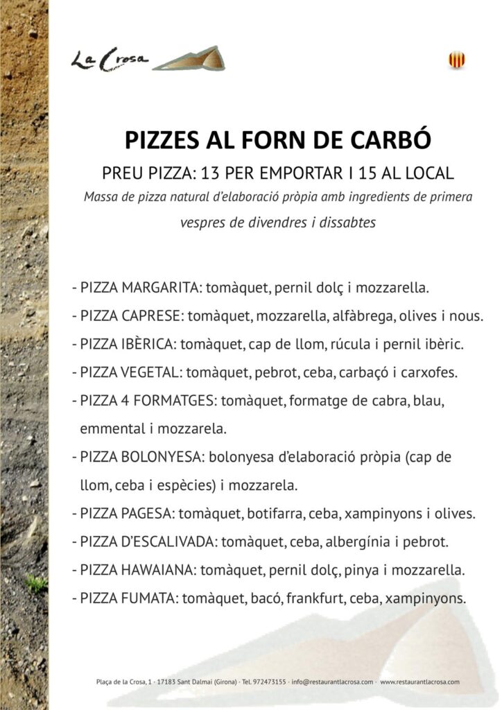 Si busques pizzes per emportar amb gust autèntic a la comarca de La Selva (Girona), a Restaurant La Crosa les preparem com s’han fet sempre: amb massa natural d’elaboració pròpia, ingredients de qualitat i cocció al forn de carbó.